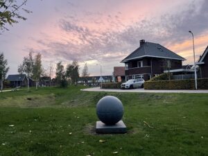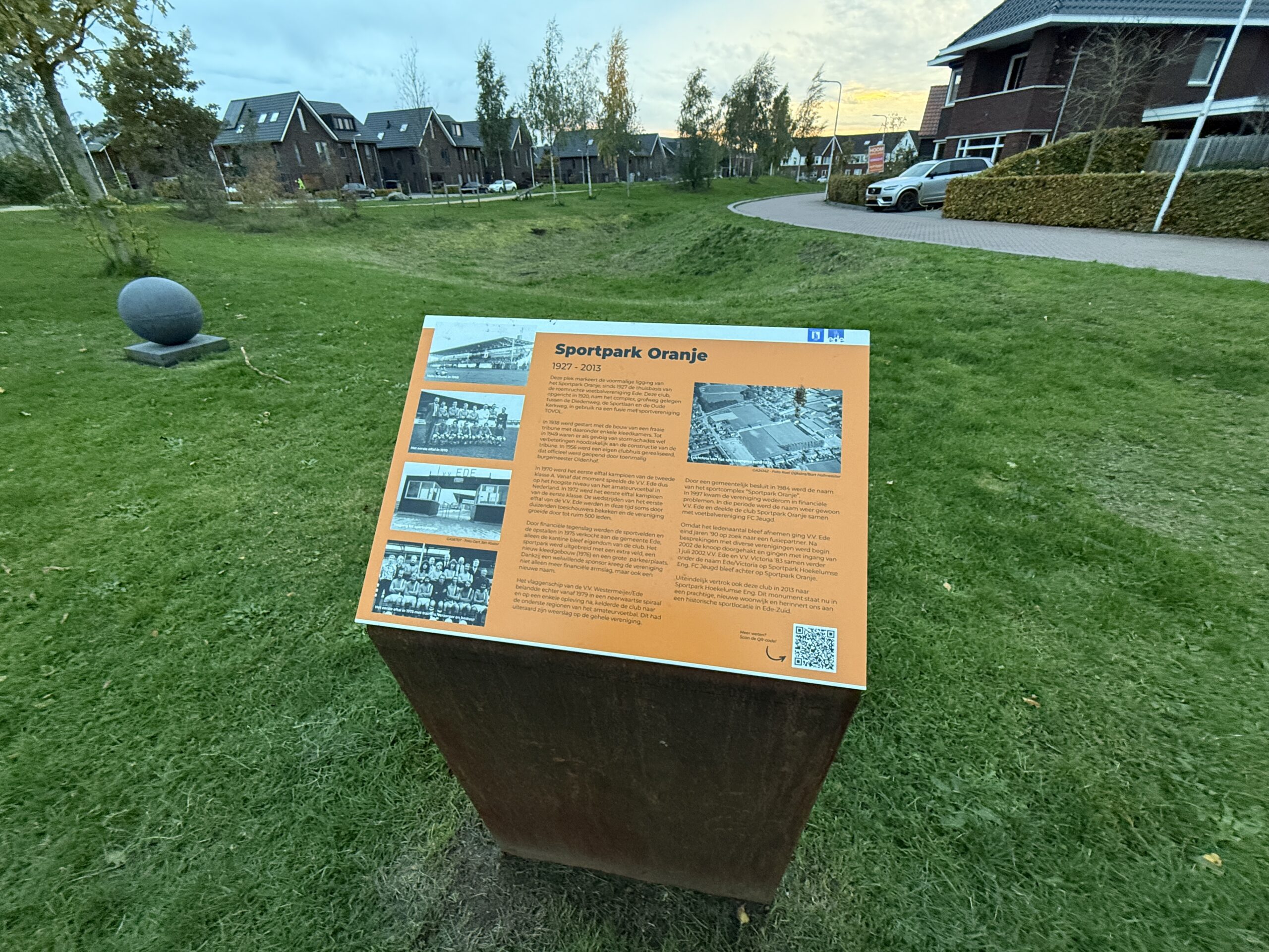 Tot slot fietsten we naar de Suriestraat waar in het Park Reehorst Noord een herinneringszuil is geplaatst met beeld en tekst over de roemruchte Voetbal Vereniging Ede, geflankeerd door een grote betonnen voetbal. Op deze locatie, het toenmalige Sportpark Oranje, konden voetballers en liefhebbers genieten van de voetbalsport, vaak op hoog niveau. In 2013 vertrok de vereniging naar Sportpark de Hoekelumse Eng, waarna er een fusie volgde met Ede Victoria. Via een QR-code op de zuil en op deze website is meer te lezen over de historie van de VV Ede, die in 1920 werd opgericht.